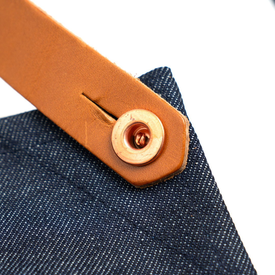 Napa latigo tan 7oz leather//Raw copper brass button//Cotton navy webbing