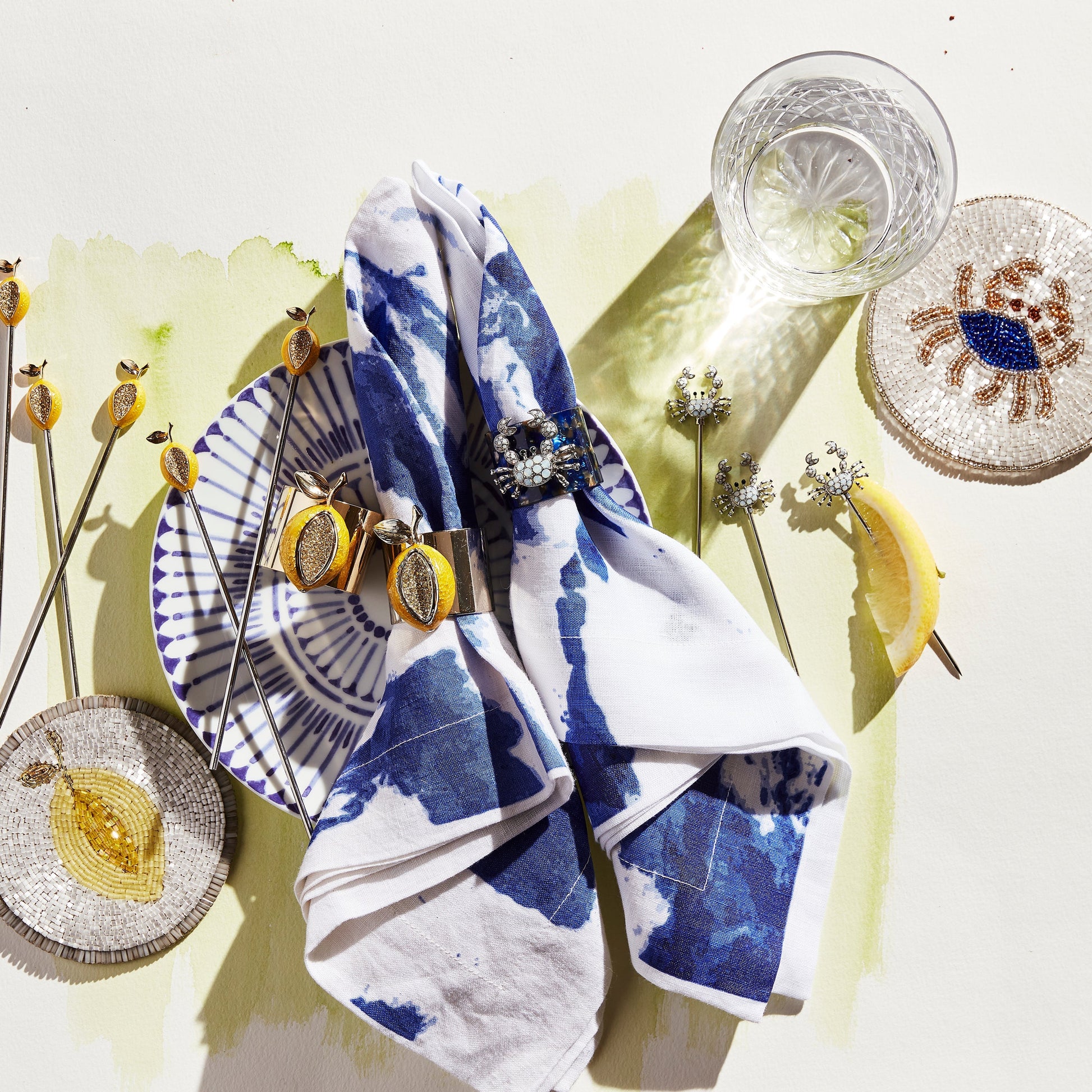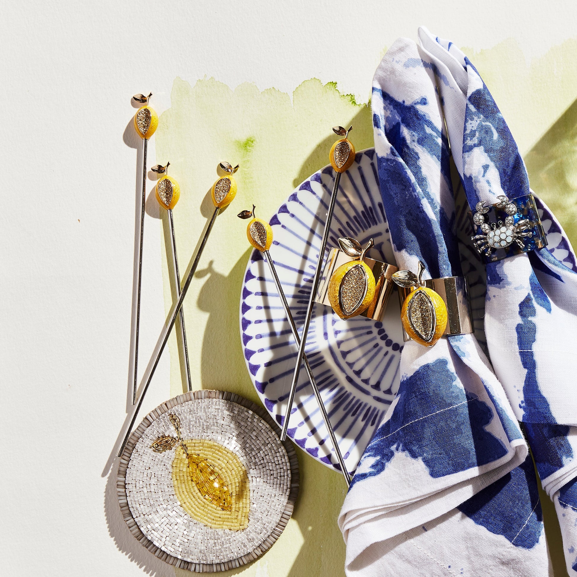 I am thrilled to bring you these hand-beaded lemon coasters that match our new lemon swizzle sticks and lemon napkin rings! Wonderful for any citrus drinks you may be thinking of serving and just a lovely, fresh moment for any table!