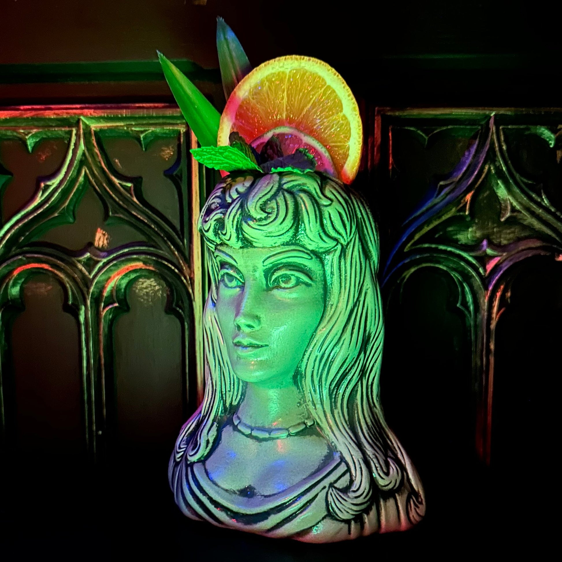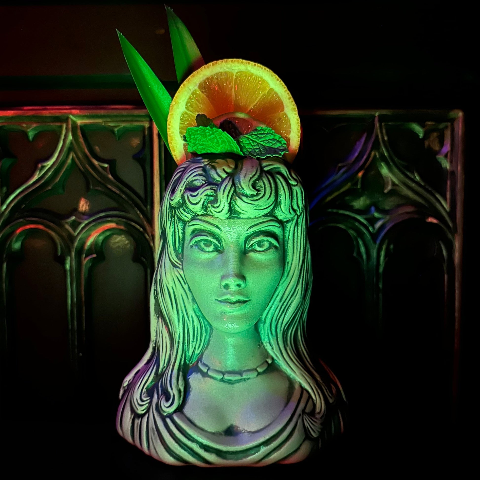 - THIS MUG IS SHOWN IN DIFFERENT LIGHTING SITUATIONS. PLEASE LOOK AT ALL OF THE PHOTOS. THE PHOTOS OF THE MUG IN THE BRIGHTER NATURAL LIGHT ARE THE MOST ACCURATE TO TRUE COLOR. More details below in "About this Tiki Mug" section.